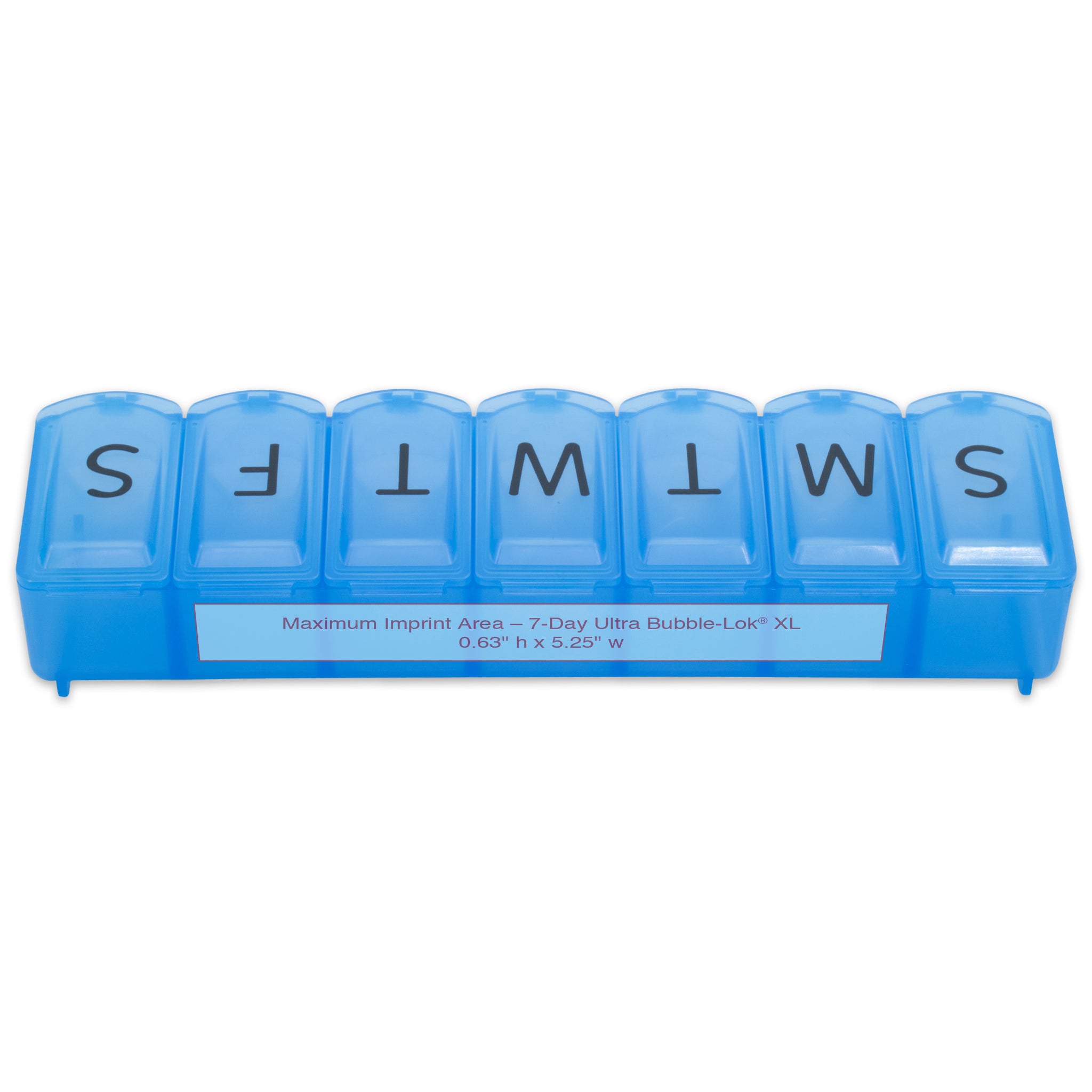 Description: XL Seven pill compartments for weekly organization. Compartments are contoured for easy pill removal. Unique design is easy to open and offers secure storage.